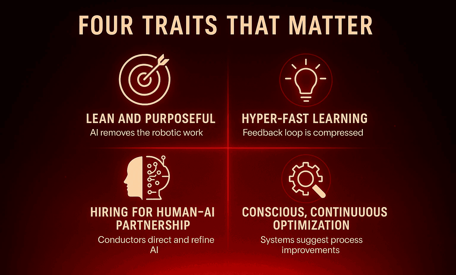 The top skill is not only coding. It is directing AI effectively. AI-native teams hire conductors who can prompt, critique, and refine system output to consistent quality.