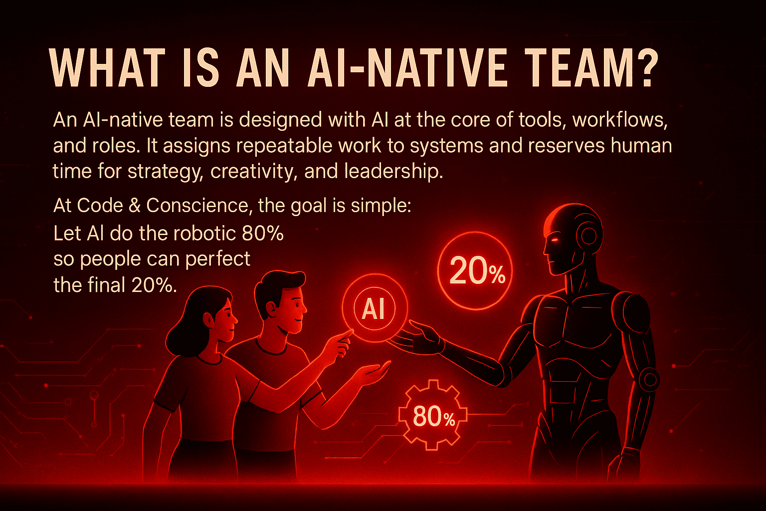 An AI-native team is designed with AI at the core of tools, workflows, and roles. It does not bolt a chatbot onto yesterday’s process. It assigns repeatable work to systems and reserves human time for strategy, creativity, and leadership. At Code & Conscience, the goal is simple. Let AI do the robotic 80% so people can perfect the final 20%.
