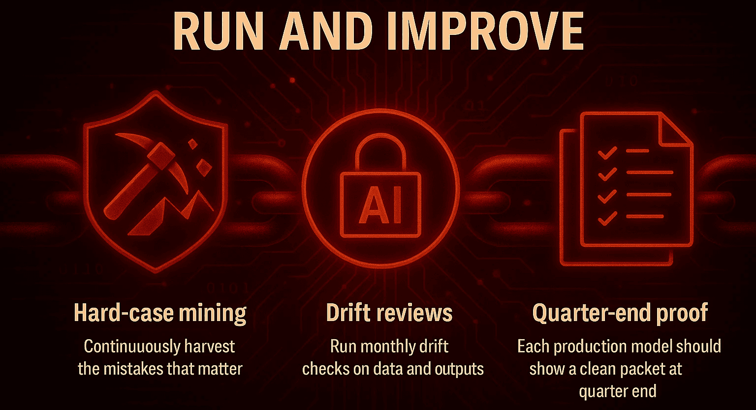 Hard-case mining: Continuously harvest the mistakes that matter. Label, retrain, and attach those cases to the lineage record so reviewers see progress, not promises.